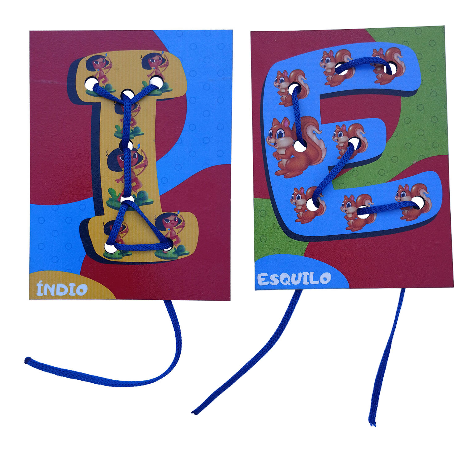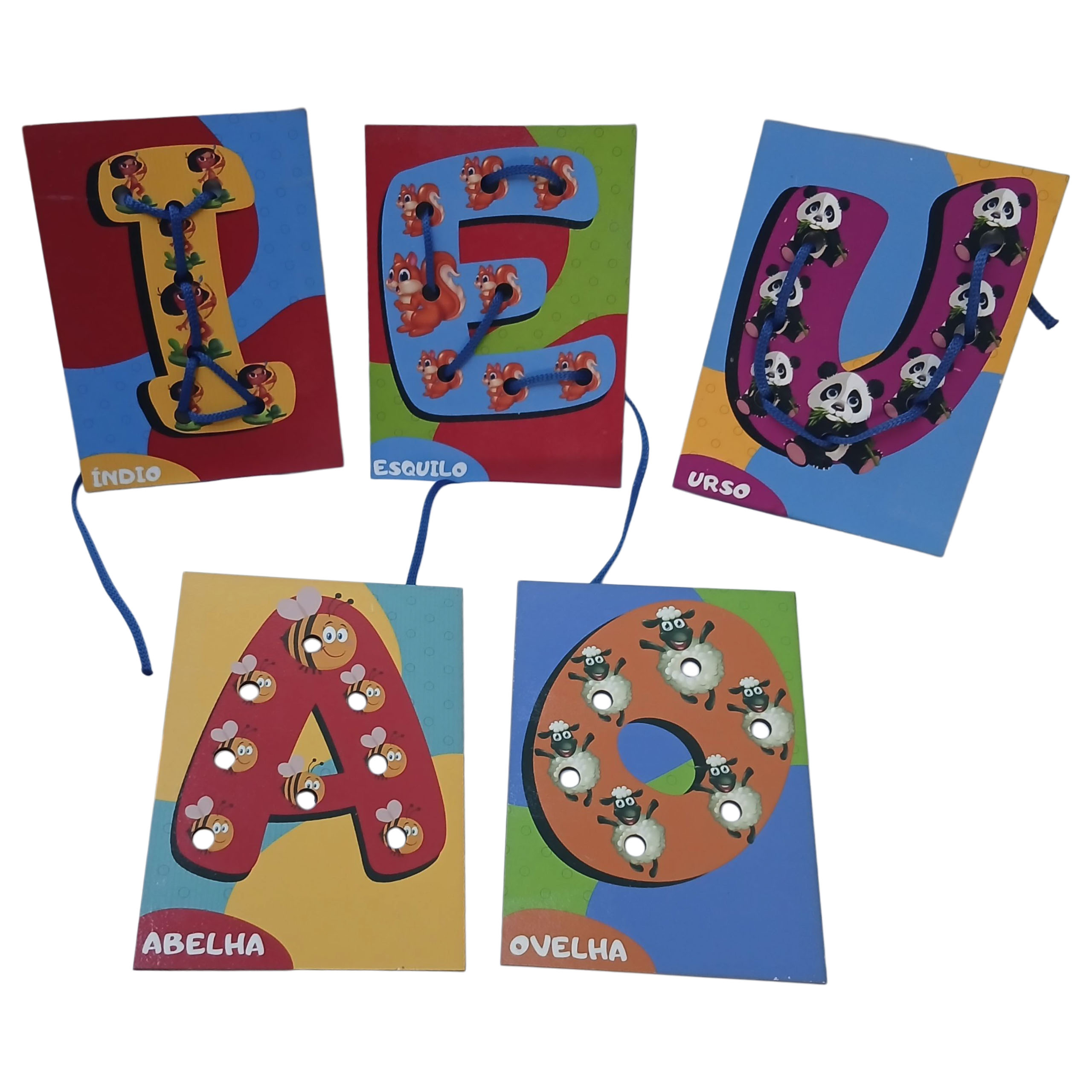 Lindo Brinquedo Educativo com placas de madeira das Vogais e cordões para alinhavar!