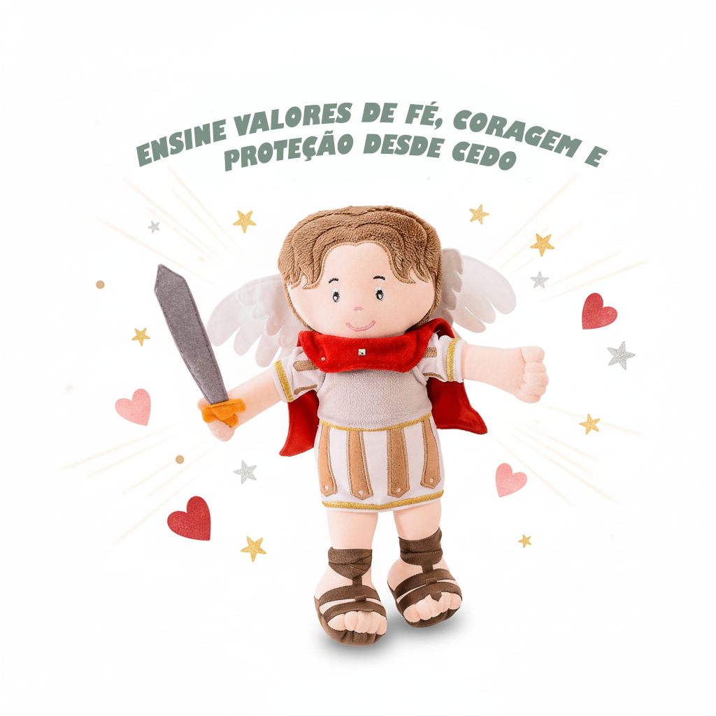 Com 32x15cm, o Boneco de Pelúcia SÃO MIGUEL é antialérgico e feito em tecido extra macio, perfeito para abraçar e expressar fé, amor e esperança.