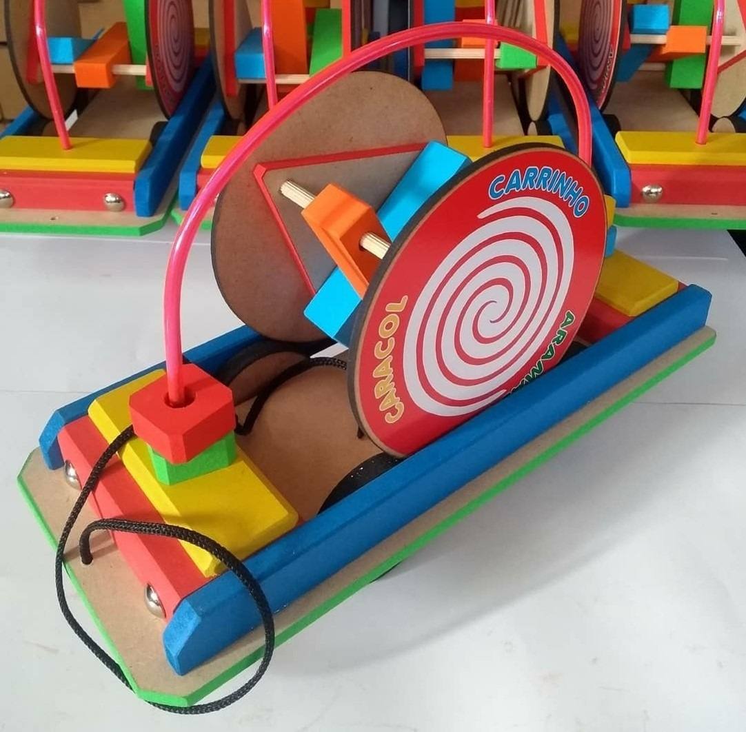 Ao puxar o carrinho com a cordinha as peças de madeira de dentro do caracol ficam batendo e emitindo som que diverte as crianças!
