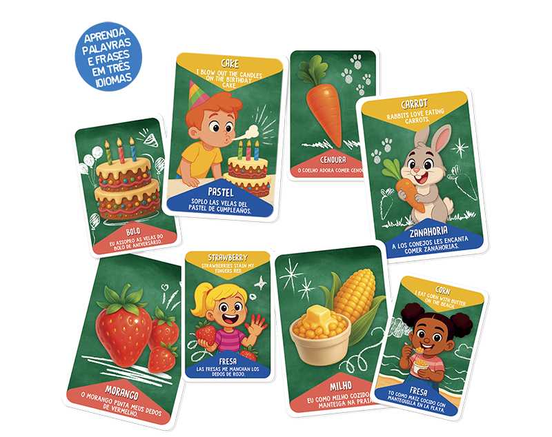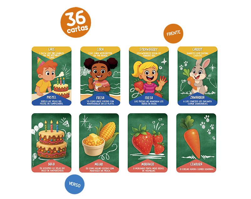 Este jogo estimula o aprendizado de palavras em três idiomas diferentes: português, inglês e espanhol, associando-as a frases do cotidiano. Brinque de várias formas!