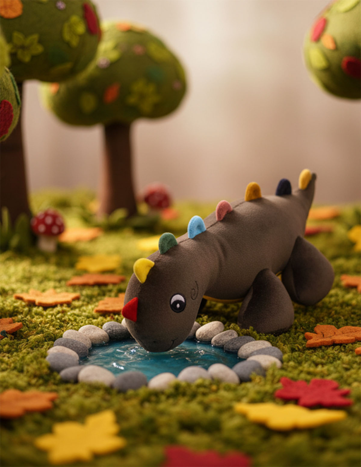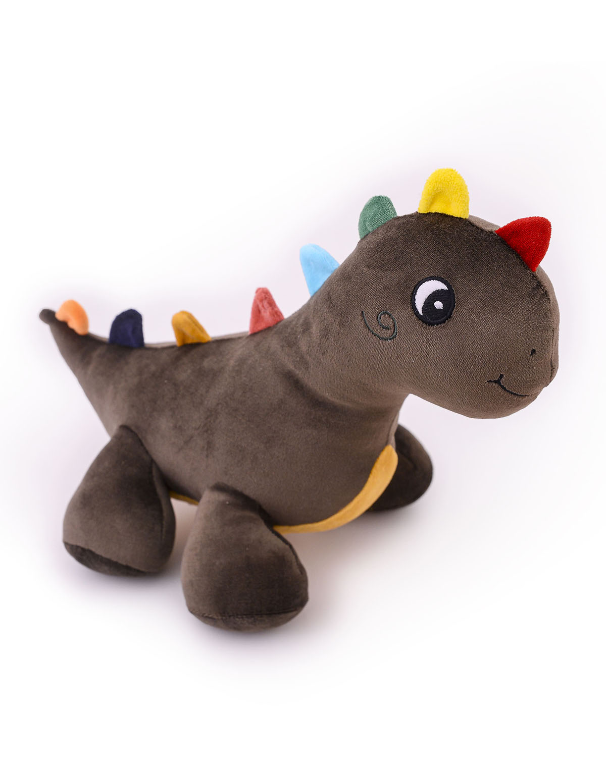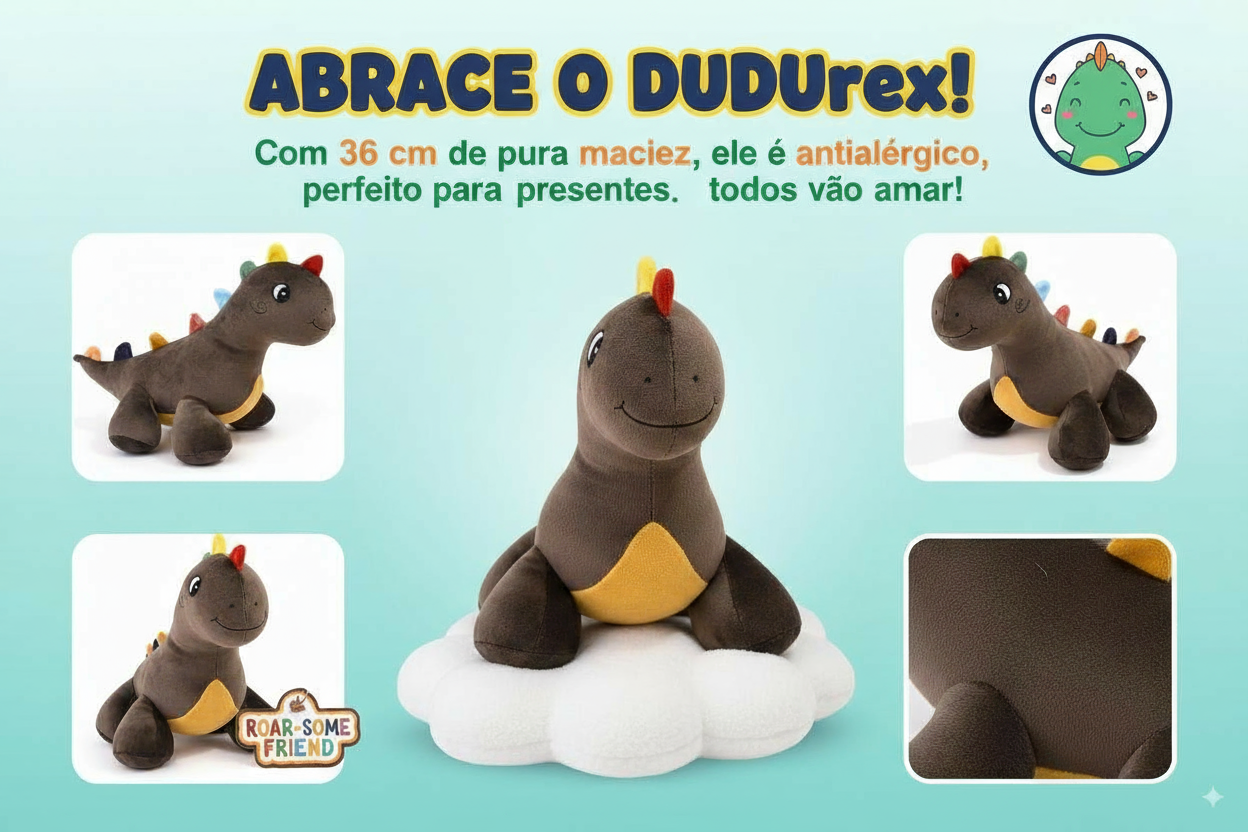 Com 30cm, feito de algodão e poliéster, o Dinossauro Dudurex é macio e muito simpático.