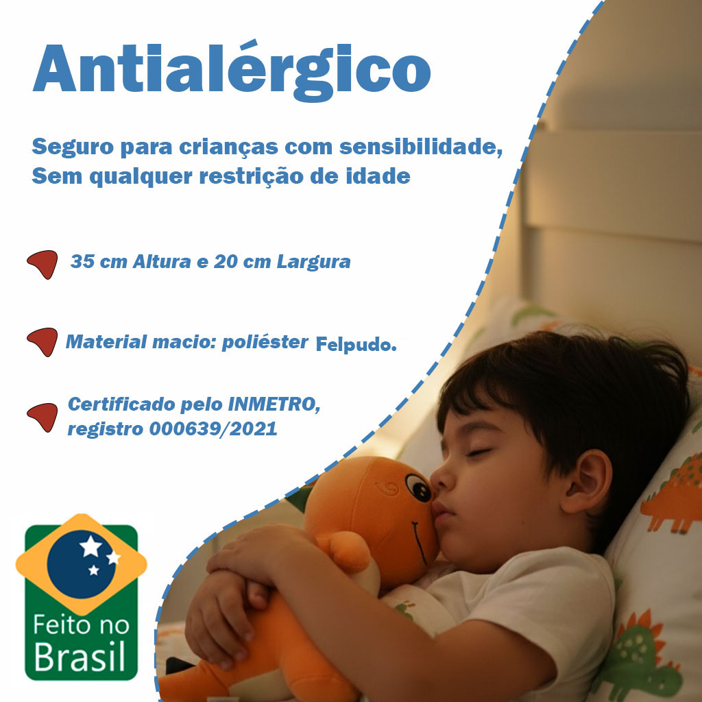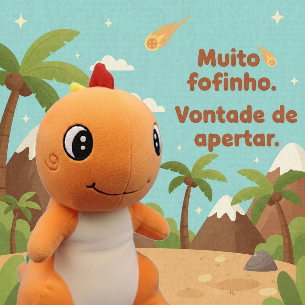Com 30cm, feito de algodão e poliéster, o Dinossauro Fofossauro é macio e muito simpático.