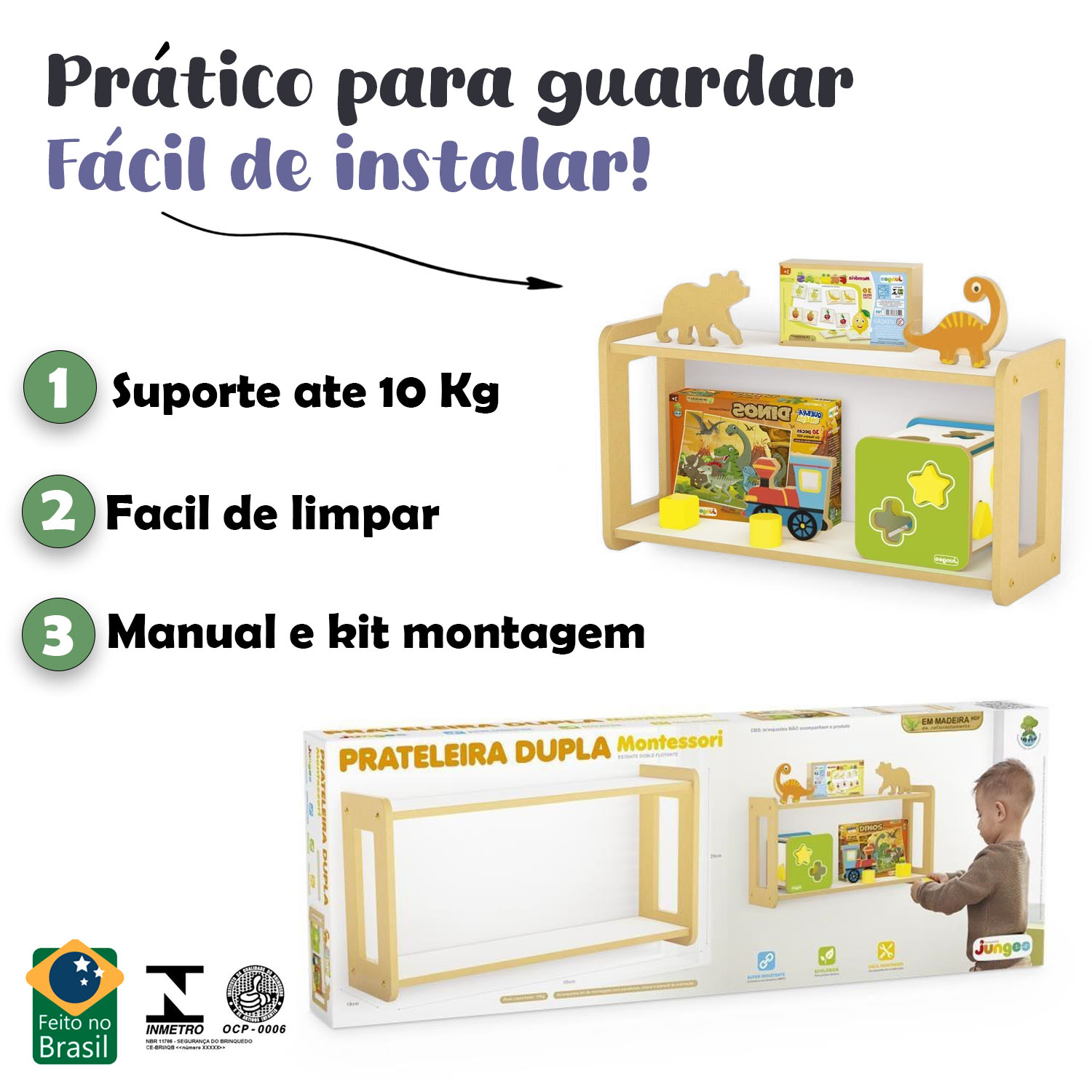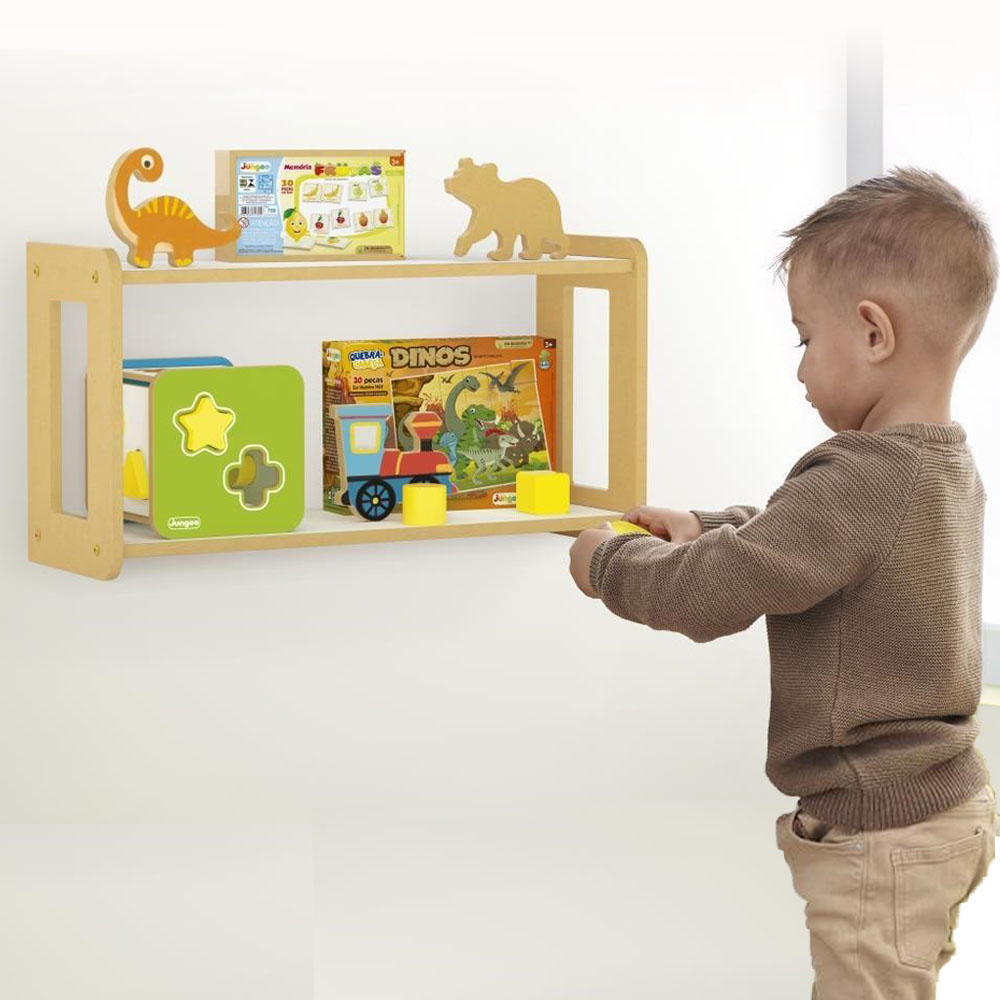 A Prateleira Dupla Montessori da Junges em MDF reflorestado com pintura atóxica estimula a autonomia e facilita o dia a dia.