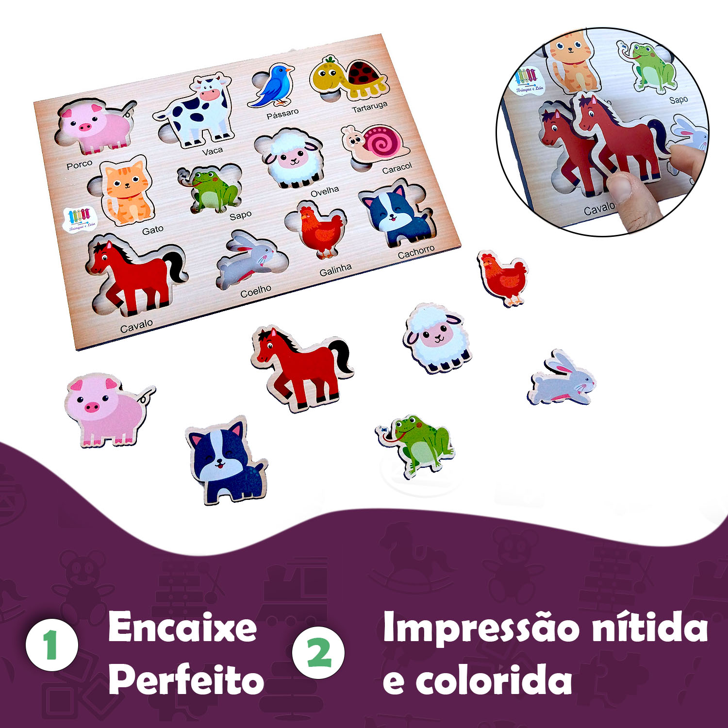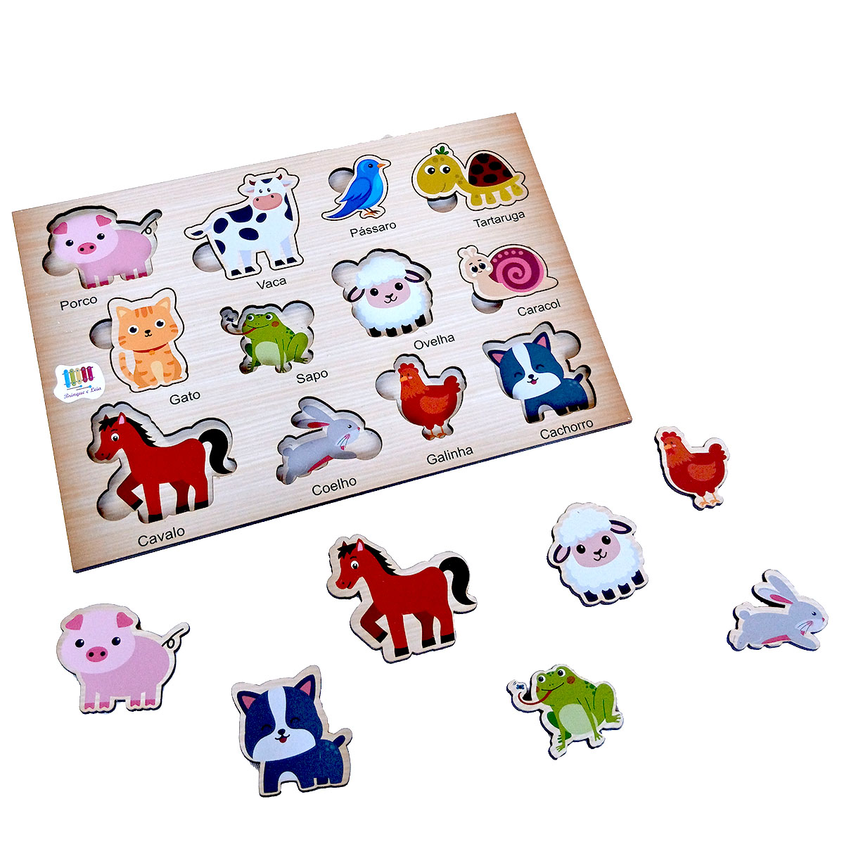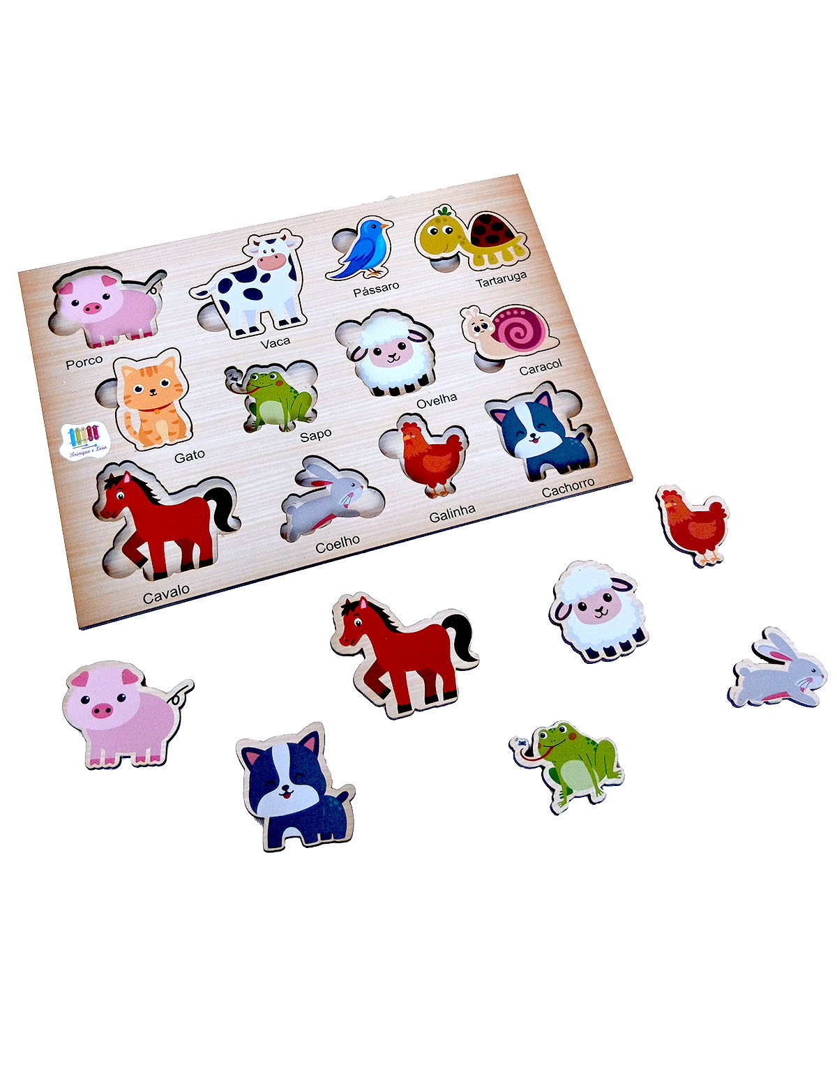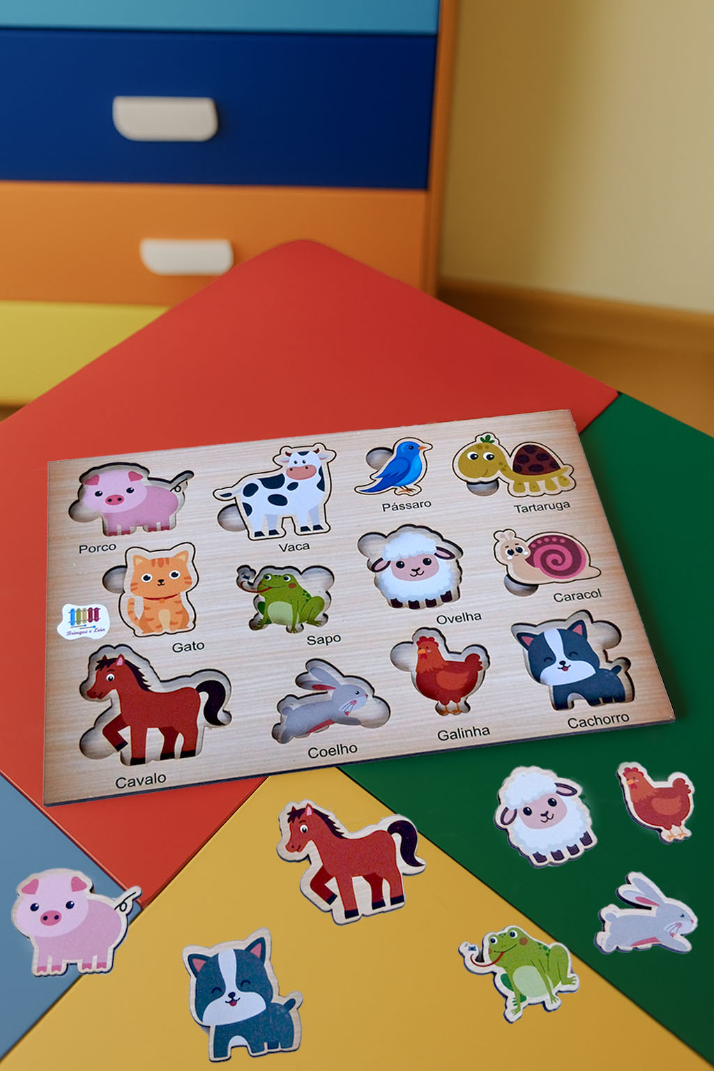 Tabuleiro de encaixe com lindas ilustrações de animais e seus respectivos nomes.
