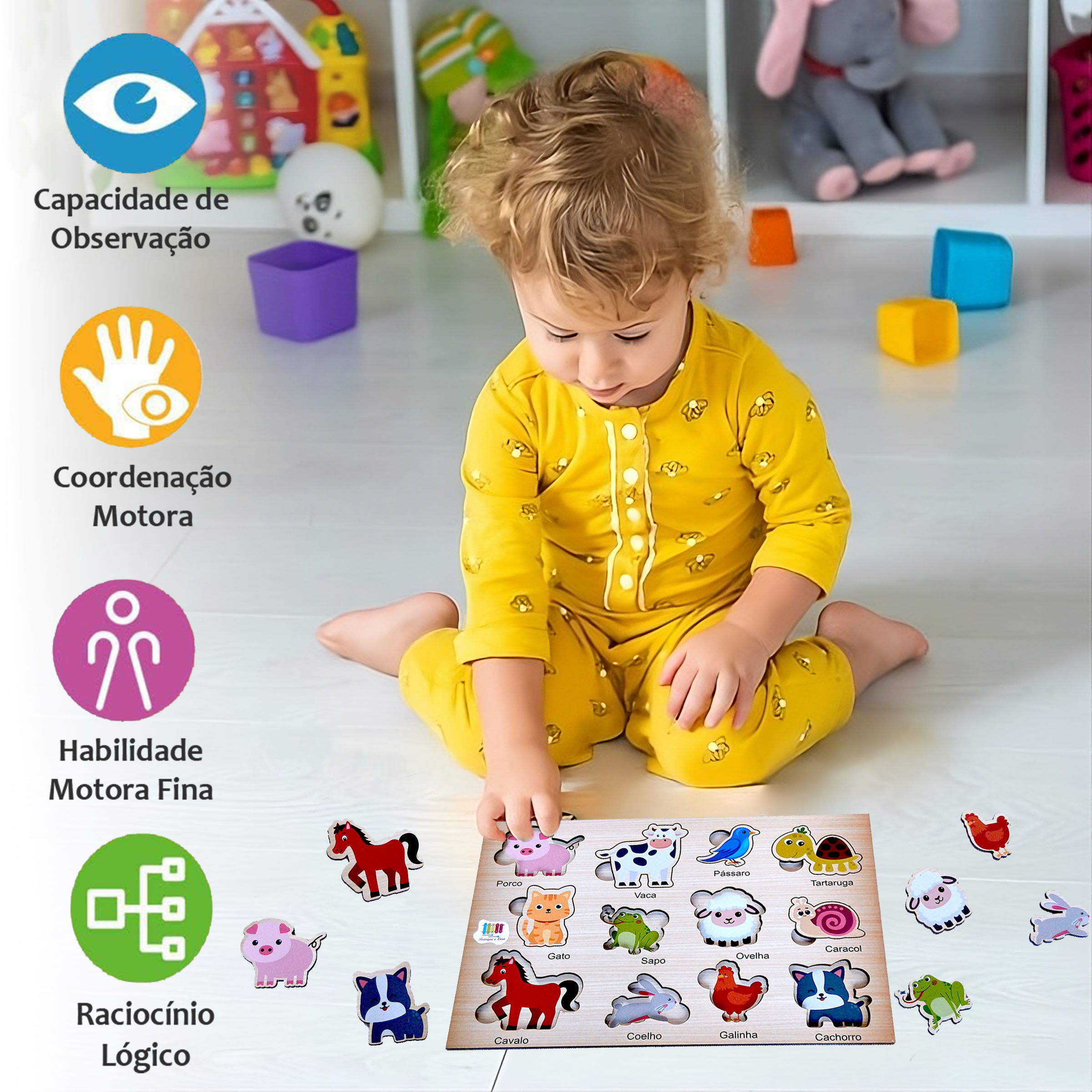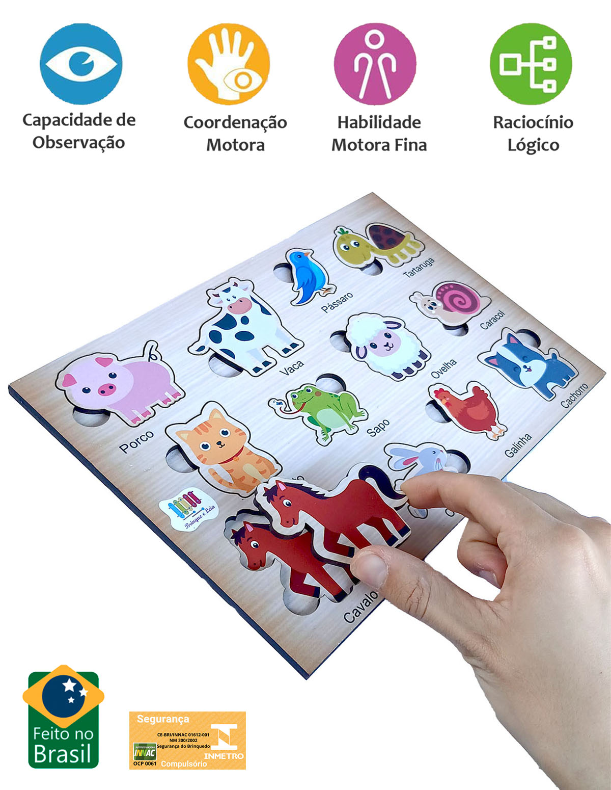 Estimula o desenvolvimento da coordenação motora, o raciocínio lógico e o conhecimento dos animais e seus nomes.