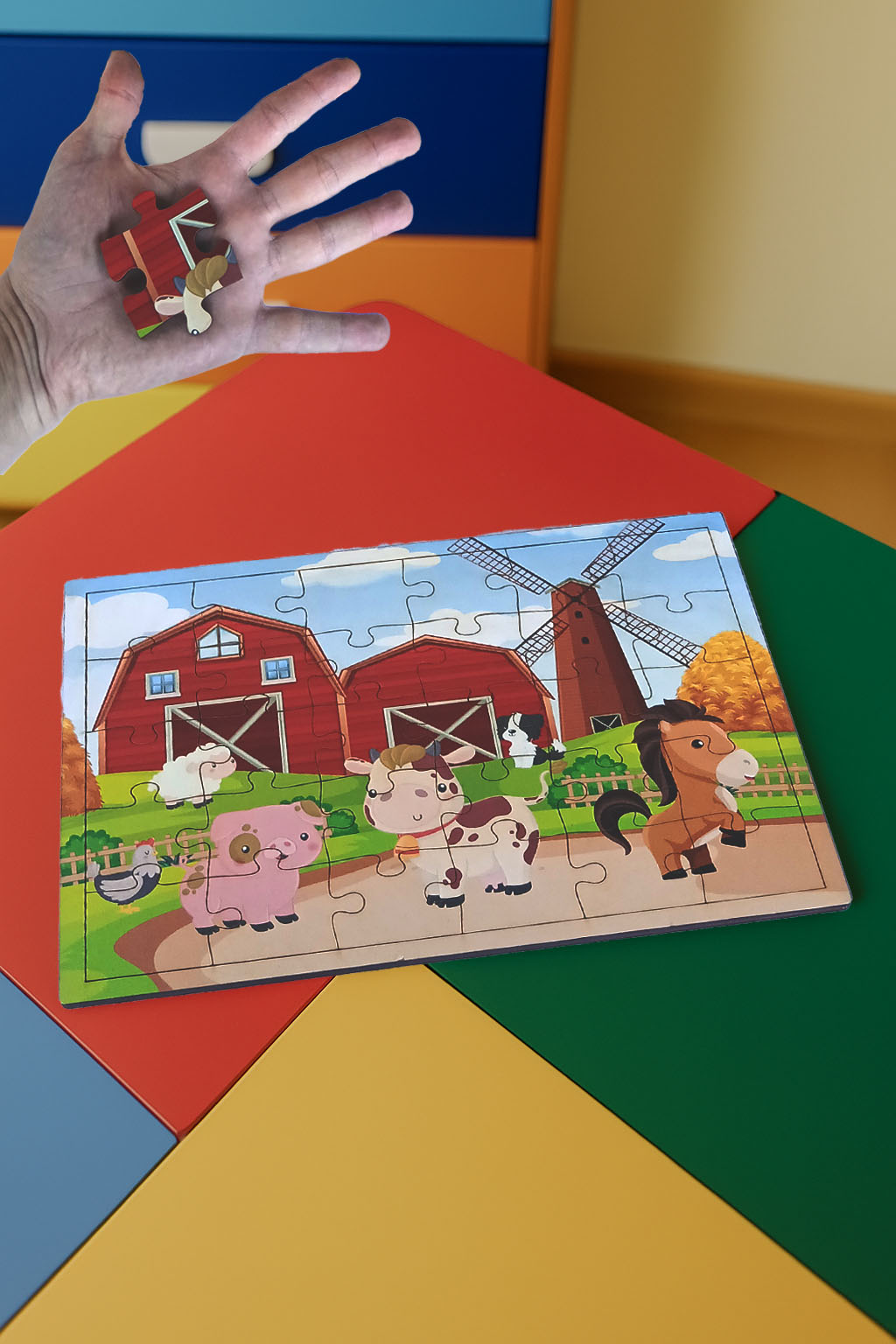 QUEBRA CABEÇA COM PEÇAS GRANDES EM MADEIRA E TABULEIRO PARA MONTAR